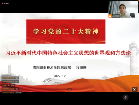 程珊珊以“习近平新时代中国特色社会主义思想的世界观和方法论”为主题,从习近平新时代中国特色社会主义思想的世界观和方法论的实践依据、科学内涵、躬身践行三个方面,全面系统地解读了党的二十大精神,宣讲深入浅出,内涵丰富,逻辑严谨,思想深刻。对深刻理解和准确把握党的二十大精神有极大的启发,对师生深入贯彻落实党的二十大精神有极大的帮助。