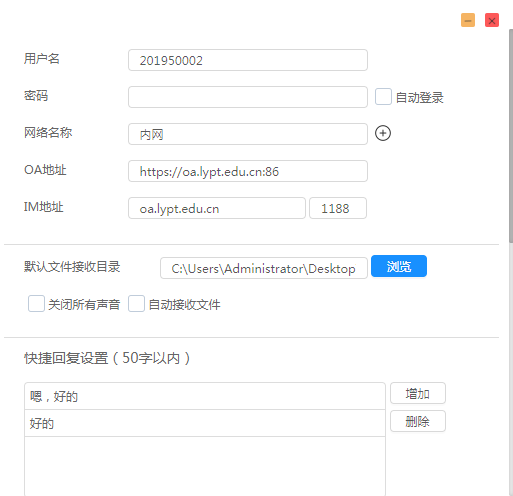 2、OA网络设置如下:用户名输入工号,按照下图设置内网地址,点击下图红圈处删掉演示地址。点右上角关闭回到登录界面