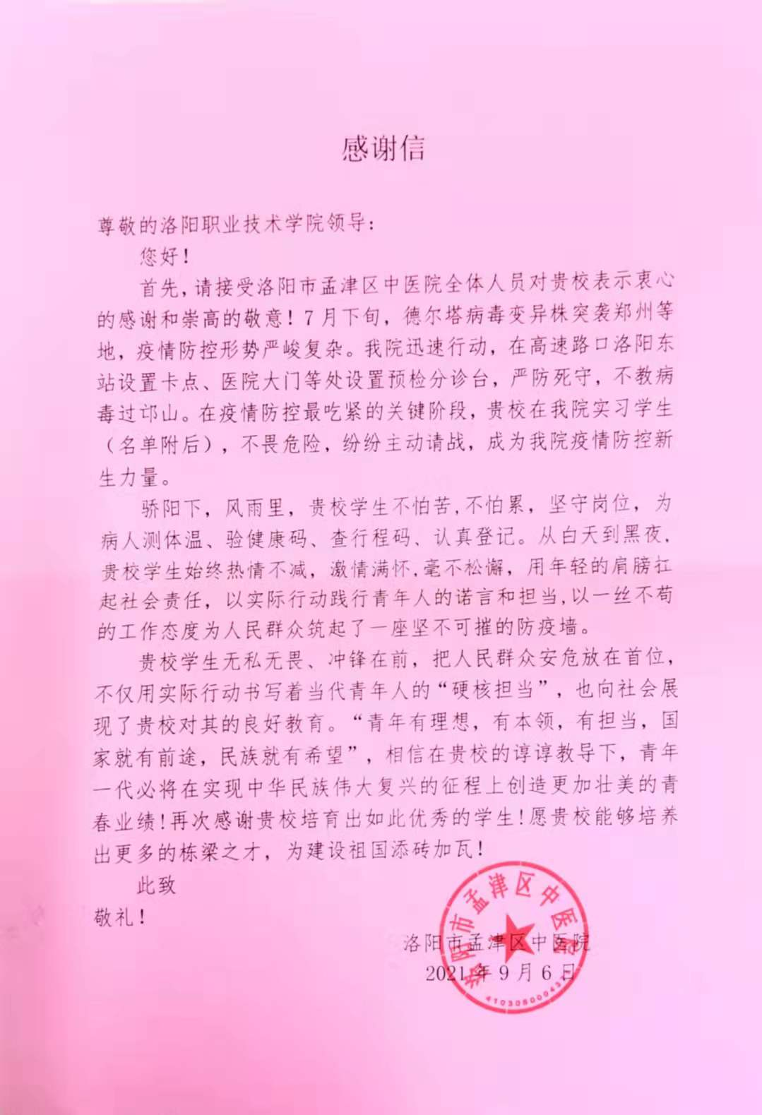9月14日,我校医学院接到一封来自孟津区中医院的感谢信,高度赞扬医学院中医学专业实习学生王少均等人在疫情面前敢于担当和无私奉献的精神。 这是咋回事儿?