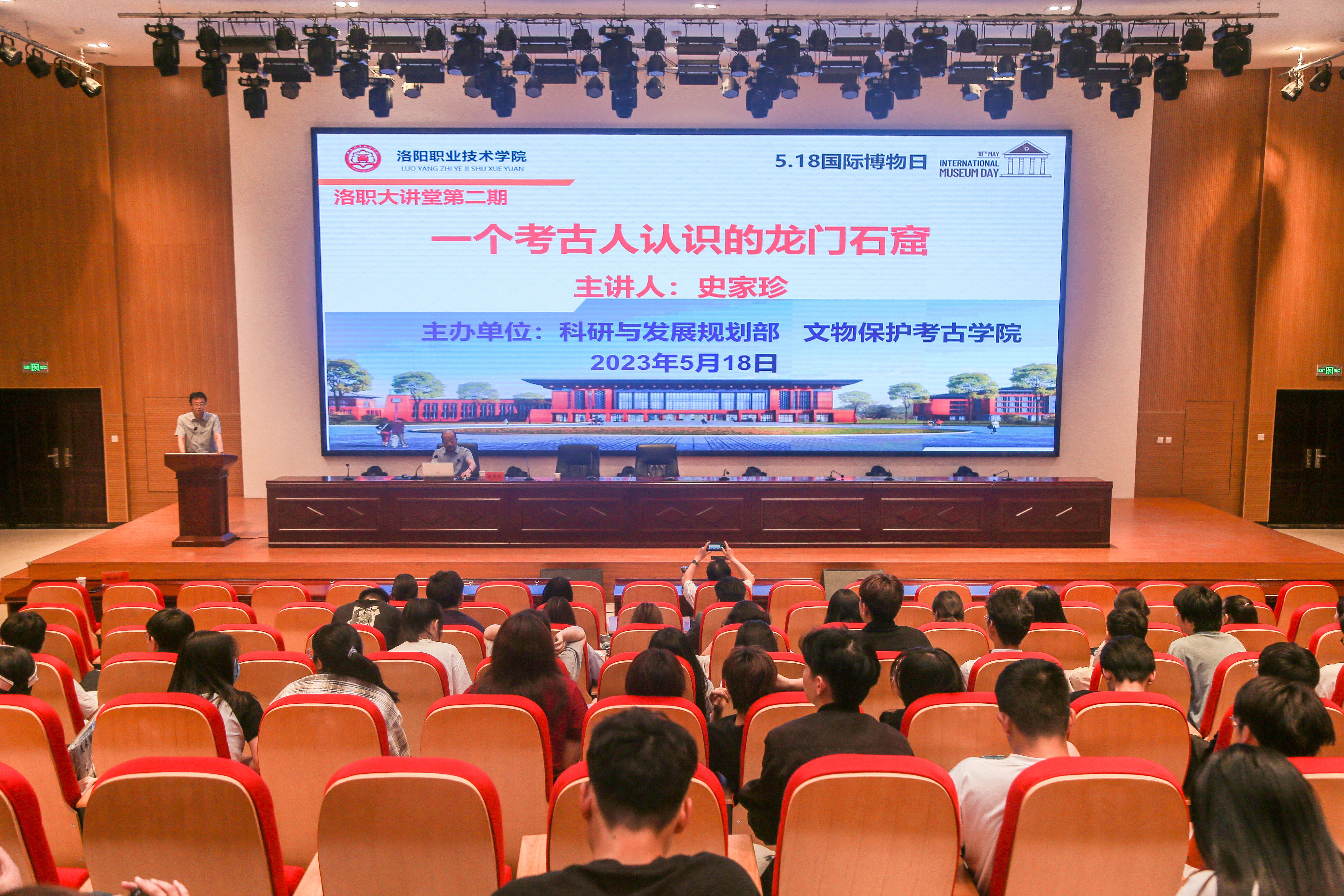 5月18日下午,“洛职大讲堂”2023年第二期讲座在大学生活动中心一楼报告厅开讲。龙门石窟研究院院长史家珍应邀到校开讲。党委书记朱美荣出席讲座并史家珍颁发客座教授聘任证书,党委宣传统战部、科研与发展规划部等部门负责人及文物保护考古学院师生代表现场聆听讲座。