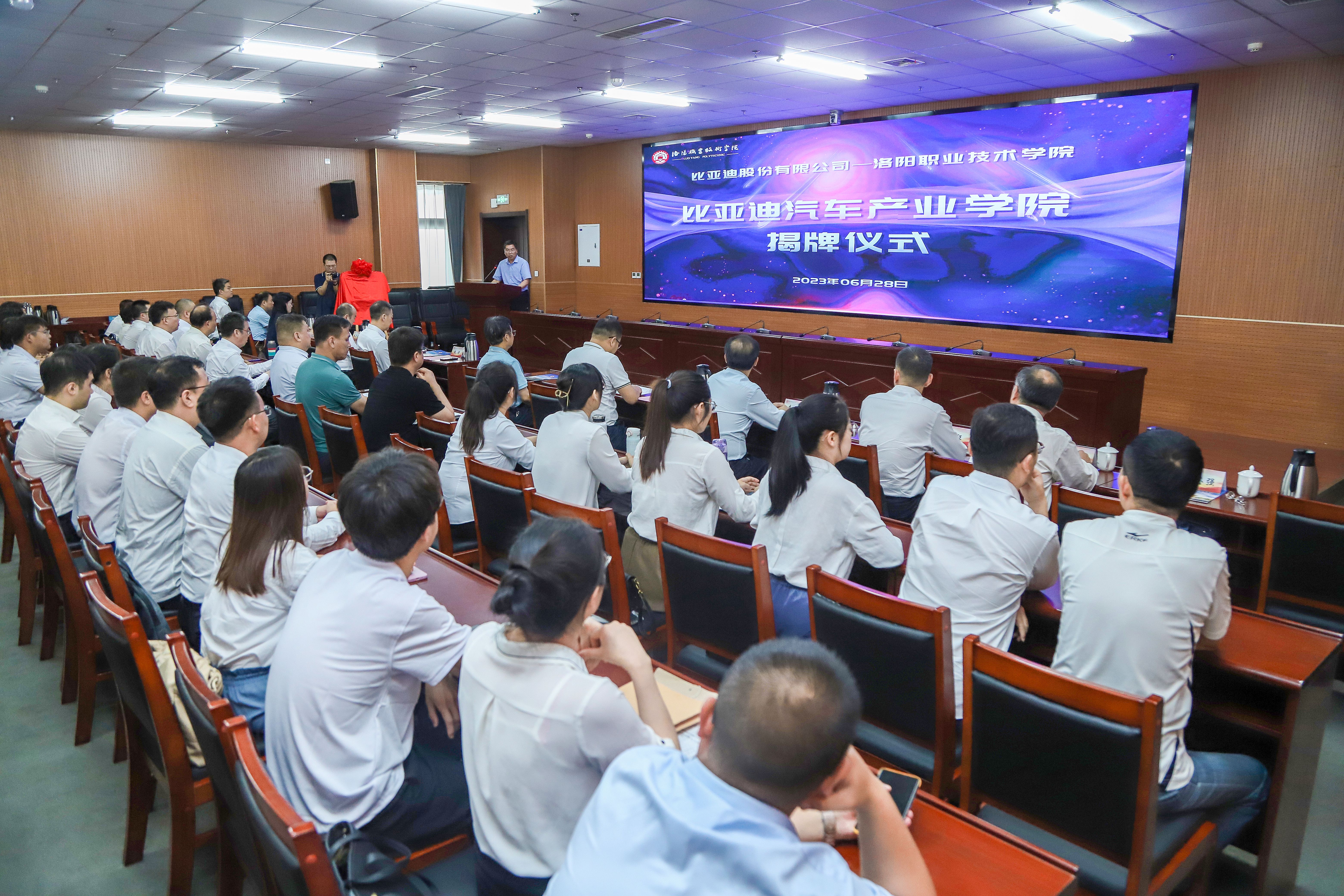 6月28日,我校“比亚迪汽车产业学院”项目揭牌仪式在图书馆930会议室举行。比亚迪股份有限公司校企合作总监刘俊鹏,比亚迪股份有限公司校企合作经理杨双喜,洛阳市人民政府驻深圳招商引资联络处主任赵汝宪,我校党委书记朱美荣,校长赵健,副校长李保安、张志友出席揭牌仪式。创新创业学院、汽车与轨道交通学院负责人及师生代表参加仪式。