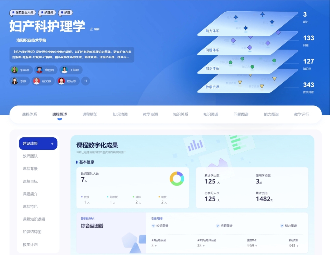 《妇产科护理学》知识图谱课程由河南省首批课程思政示范课《妇产科护理学》主持人、河南省职业教育一流核心课程(线下)《妇产科护理学》主持人朱前进带领团队建设完成,课程由教学资源、知识体系、问题体系、能力体系四层体系构成,运用了大数据、人工智能等技术,通过四维知识图谱模型体系对知识内容进行精选和重构,确保知识体系的科学性和完整性。课程从正常孕产妇的护理、异常孕产妇的护理及妇科病人的护理三大模块出发,深入生命的起源、胎儿的孕育、女性生殖系统疾病的护理等多个方面,共计梳理出知识点127个,构建问题体系133个,能力体系3个,载入教学资源343个。此外,通过智慧树AI大明白人工智能技术,引入学科发展前沿的学习资源,开阔学生视野,充实课程体系。