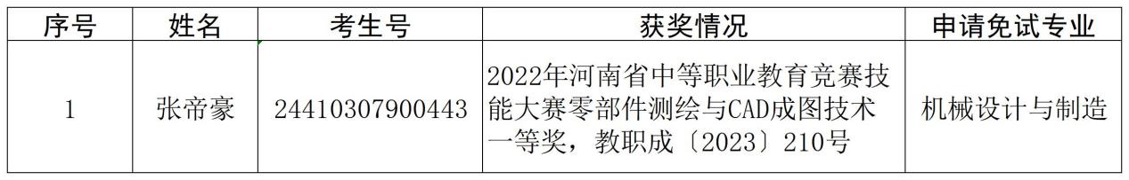 根据《洛阳职业技术学院2024年单独考试招生章程》,经考生申请、专家评审,1名考生符合技能拔尖人才免试入学条件,现将评审结果予以公示。
