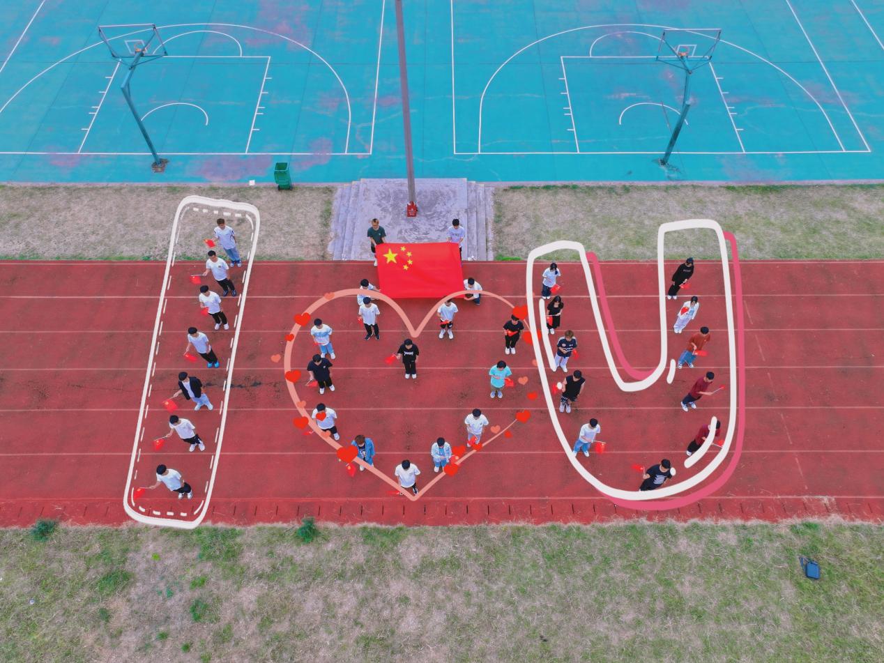 学生们自主构思并实施了造型设计,在操场上以身体为媒介,精心排列成“10.1”、“75”以及“I爱心U”等富有深意的图案,采用了无人机拍摄,结合后续的精心加工,融入装饰元素与标语,使得整个画面既生动又富有趣味性,充分展现了同学们对祖国的热爱与创意表达。
