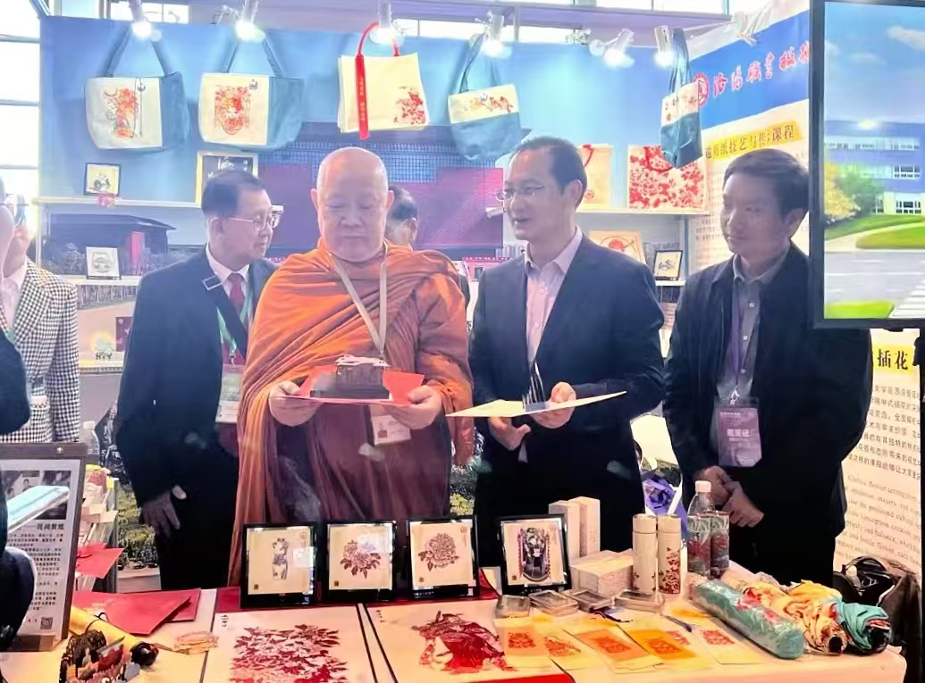 会议期间,我校作为河南省三所受邀参加中国教育交流展的学校之一,展出了非遗剪纸、中药茶饮等特色作品,全面展现了学校在非遗传承、优秀传统文化创新发展等方面所取得的成果,吸引了众多外方嘉宾参观。李保安与外方嘉宾进行了深入交流,详细介绍了近年来学校在国际交流、非遗传承等方面所取得的成绩。