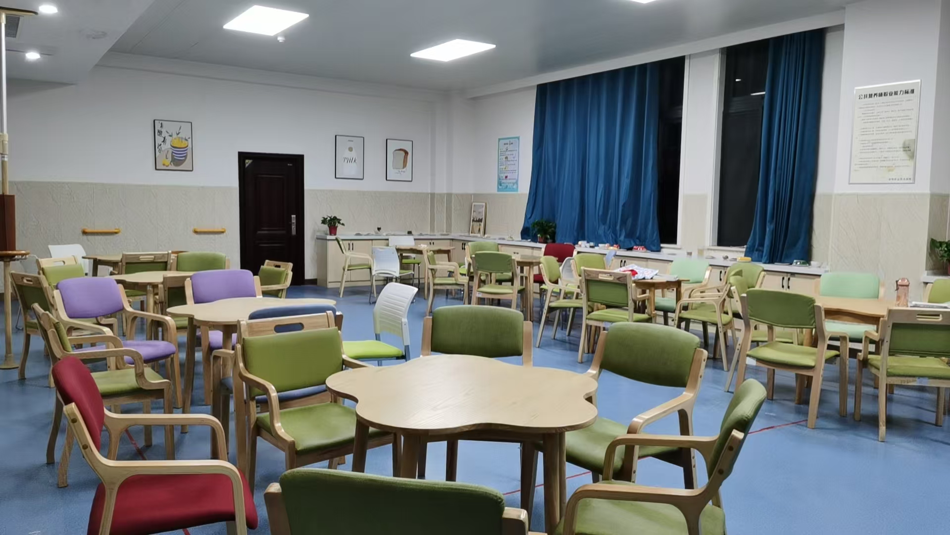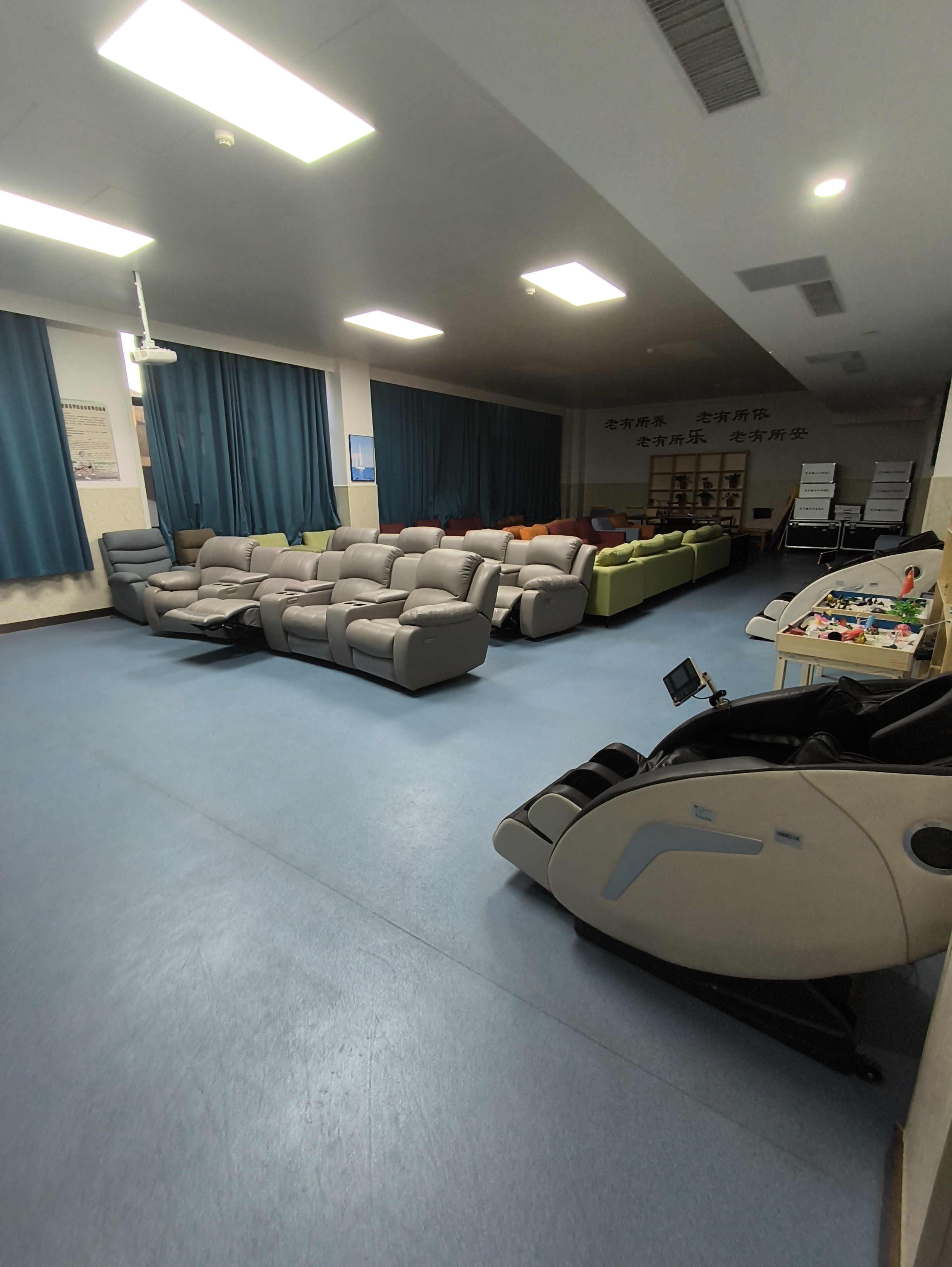 文化颐养室区域内相关设备可为老年人提供观影、K歌、舞蹈伴奏、棋牌娱乐、身心按摩放松服务,在相应集体娱乐活动中延缓老年人身体及心理衰老,提高社会适应能力。