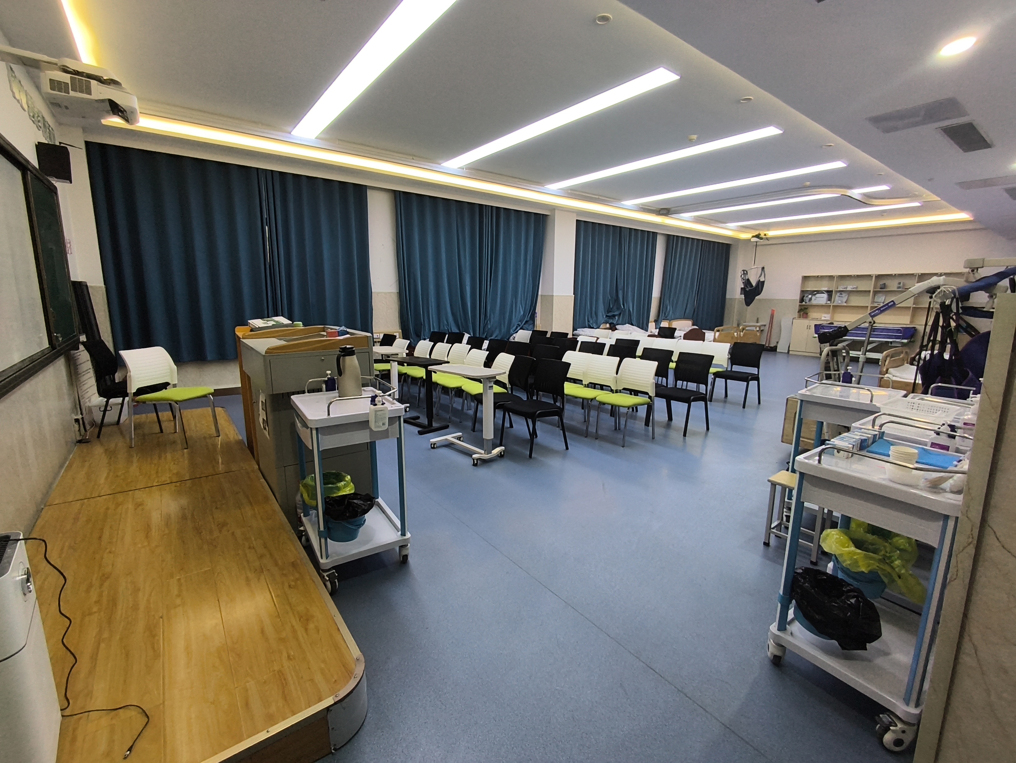 半失能老人照护室利用失能老人模型人使我们学习半失能老人的养护措施,另外配备老年移位机、电动轮椅等位移设备,能充分展现现代化的半失能老人照护情景,在半失能老人长期照护教学带教问题上更加科学化、效率化。