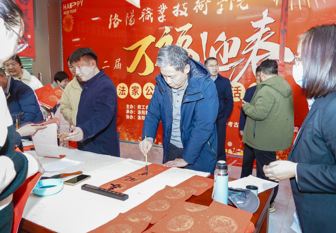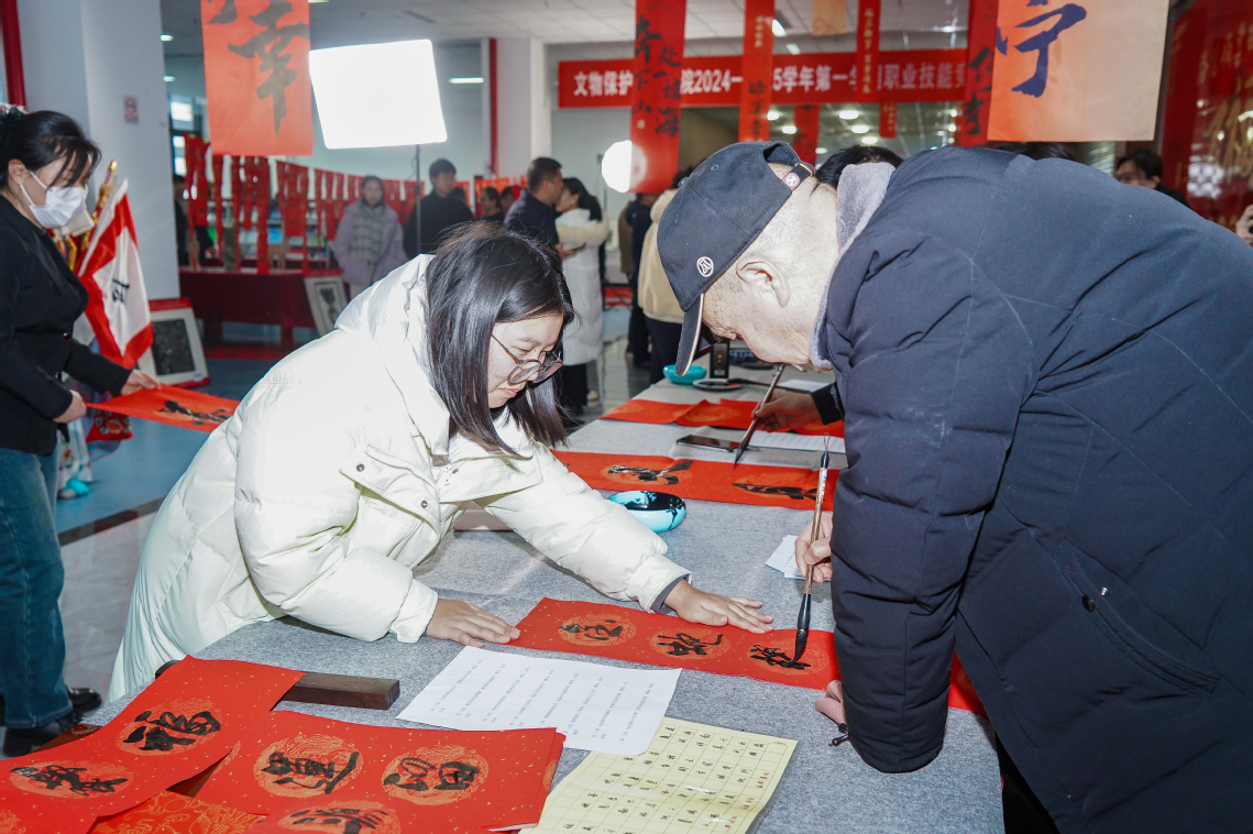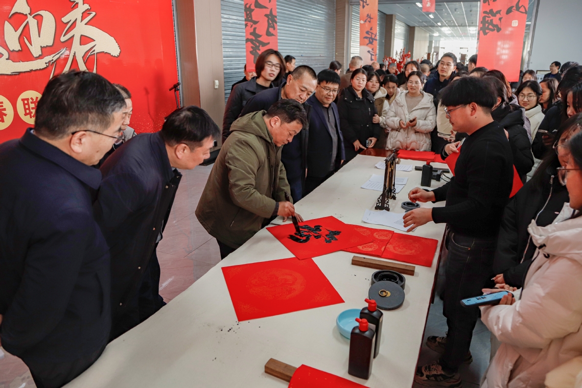 活动现场热闹非凡、一派喜庆祥和,广大师生积极参与,书法家挥毫泼墨,根据师生的具体需求内容,现场书写春联。一幅幅红彤彤的春联、一张张喜庆的“福”字,表达了学校对广大师生的新年祝福和对即将到来的农历春节的美好祝愿。