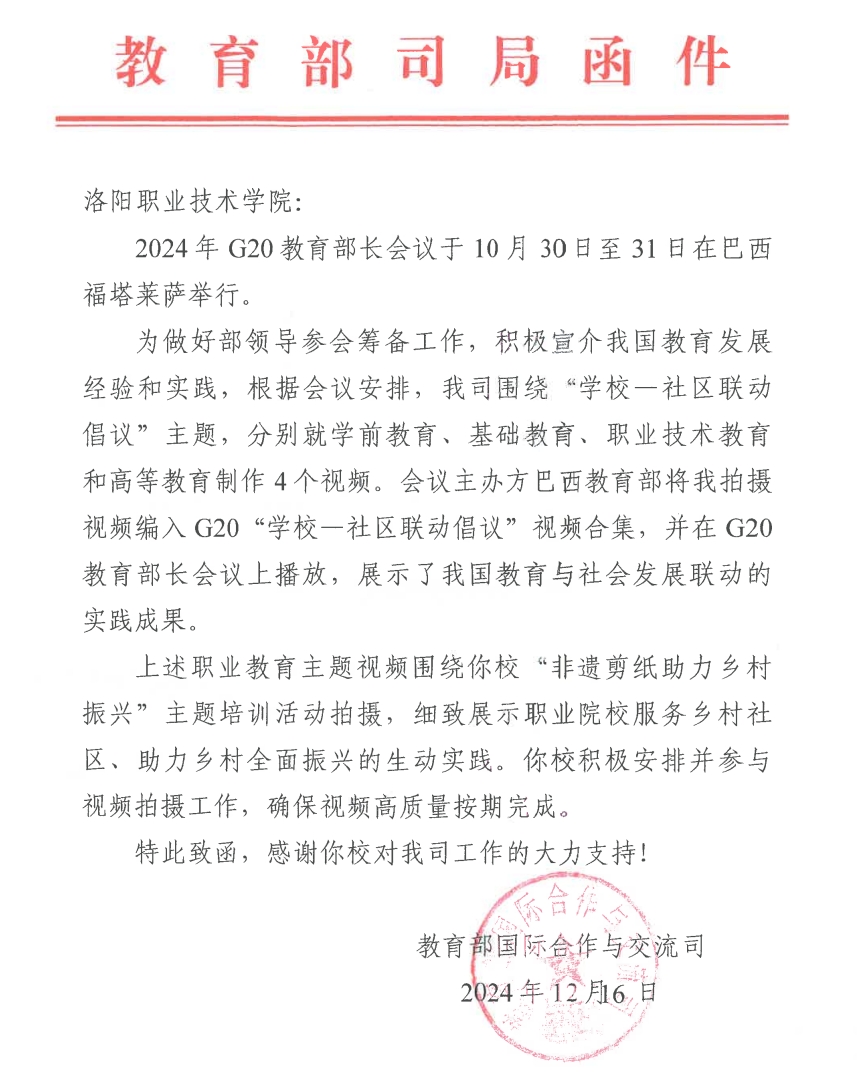 近日,我校收到了教育部国际合作与交流司发来的感谢信,对学校积极参与2024年G20教育部长会议职业教育主题视频创作表示感谢。