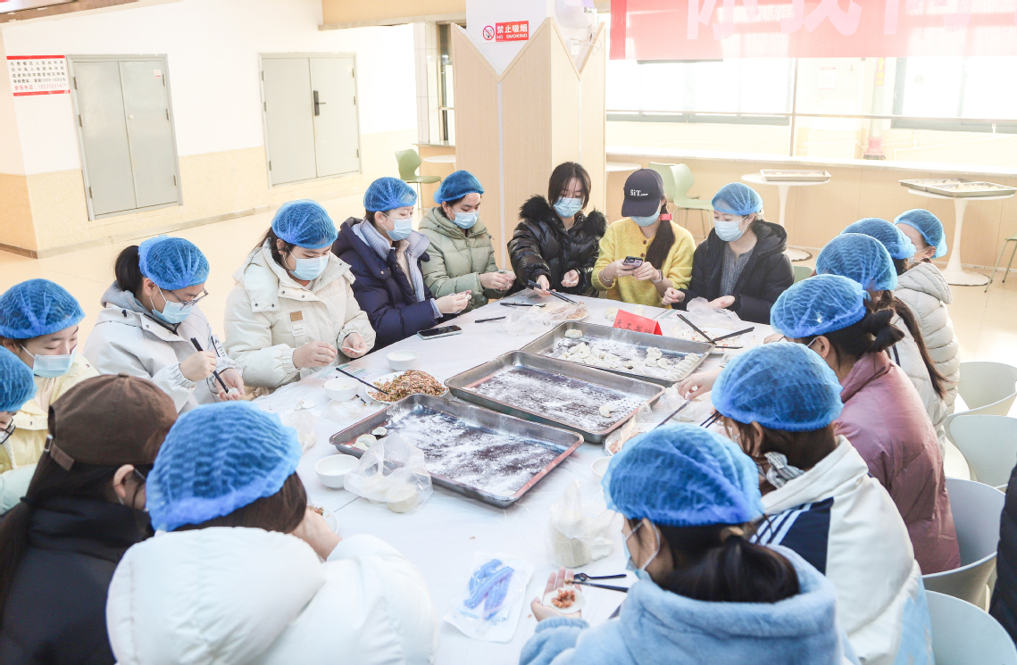 各餐厅早早地准备好了所需的各种食材和用具,各学院师生代表和餐厅工作人员一道亲自动手包饺子。在带队教师的引导下,同学们有序分组、分工协作,洗手、揉面、擀皮、包馅有条不紊地进行。手法娴熟的同学,捏褶塑形一气呵成,圆润饱满的饺子转眼成型;初次尝试的同学,则在伙伴的指导下慢慢摸索,包出的饺子虽形态各异,却饱含满满的心意与乐趣。大家一边包饺子,一边相互切磋交流,欢声笑语、其乐融融。