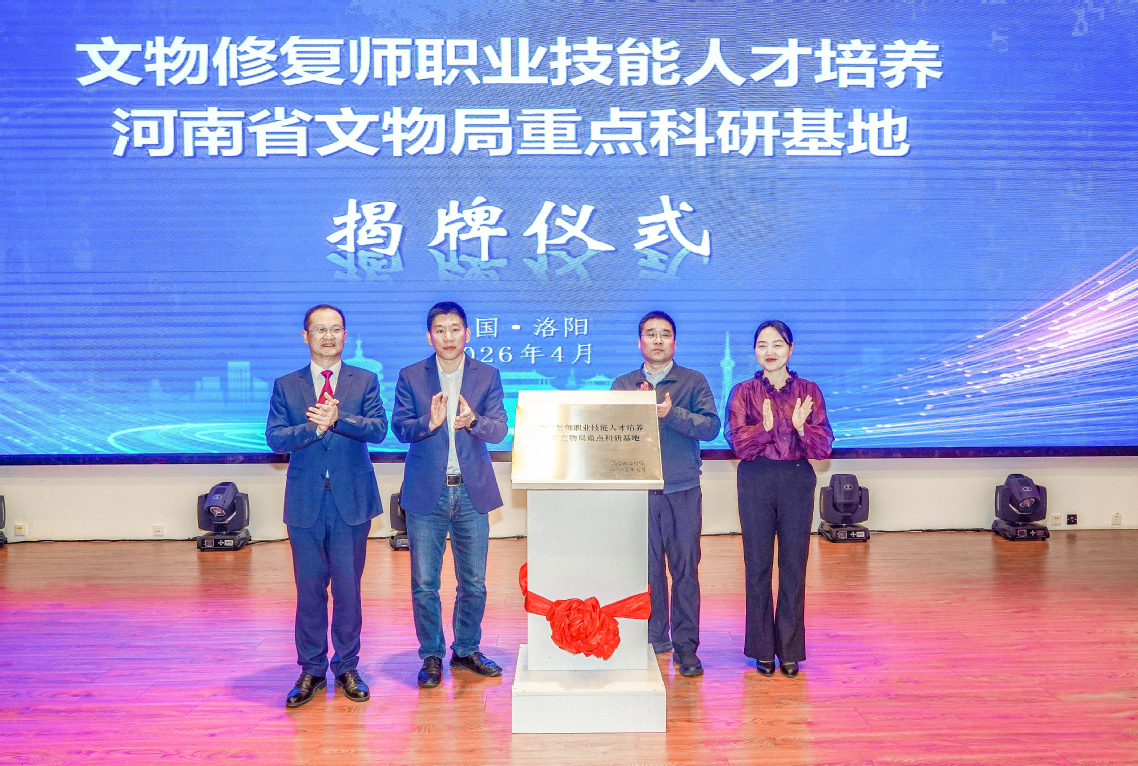 活动现场,陈昀、贾付春、丁雪峰、李保安共同为文物修复师职业技能人才培养河南省文物局重点科研基地揭牌。