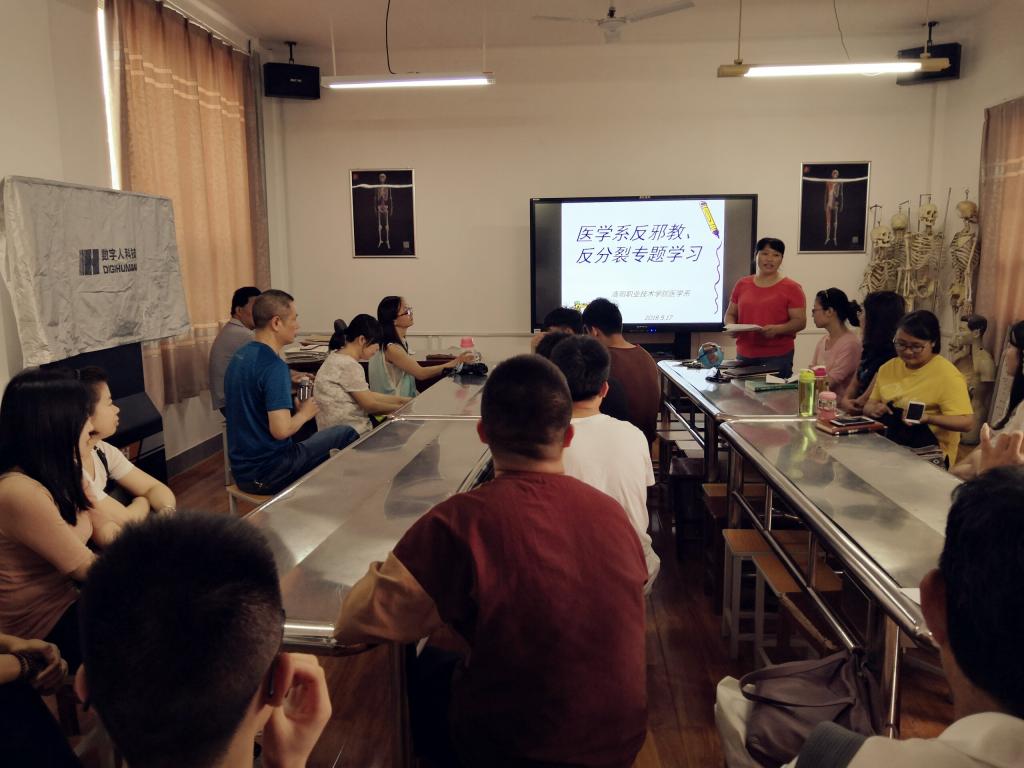 医学系组织全体教职工反邪教反分裂、反电信诈骗专题学习 2018年5月17日下午,医学系教师在南院解剖