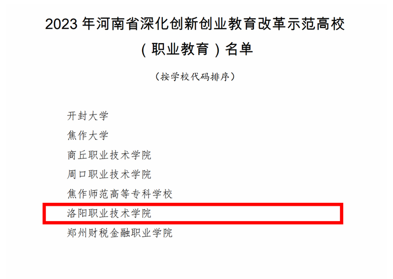 近日,河南省教育厅公布了2023年河南省深化创新创业教育改革示范高校(职业教育)名单,我校成功入选。