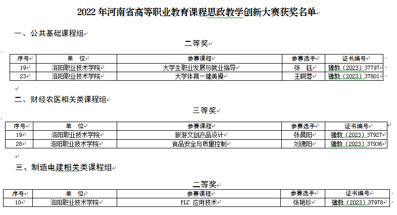 近日,河南省教育厅公布了2022年河南省高等职业教育课程思政教学创新大赛获奖名单,我校教师参赛课程共