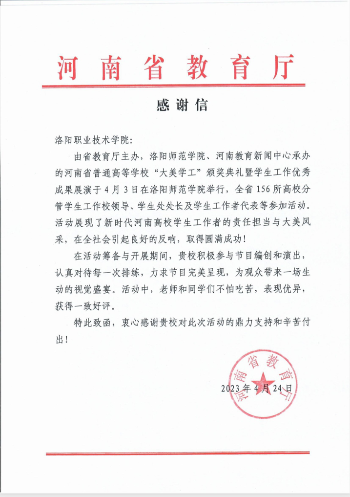 近日,我校收到河南省教育厅发来的感谢信,对我校在河南省普通高等学校“大美学工”颁奖典礼暨学生工作优秀