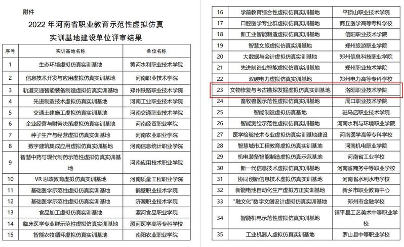 5月24日,河南省教育厅公布了2022年河南省职业教育示范性虚拟仿真实训基地建设单位评审结果,文物保