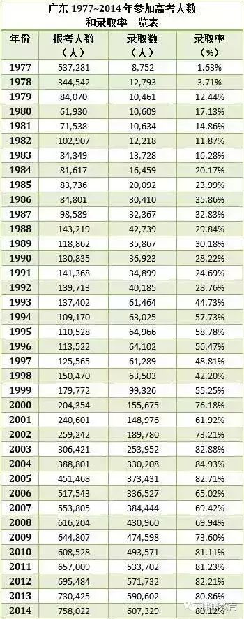 广东高考大数据!!自恢复高考以来,广东每年有多少人参加高考?录取率如何?多少人有机会上大学?请看下图