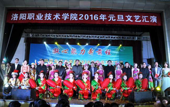汇演开始前,院党委书记李大伟发表了热情洋溢的新年致辞。他首先代表学院党委、学院领导班子,向关心学院发展的各级领导,向支持我院发展的各界朋友,向辛勤工作的教职工,向努力学习、奋发向上的同学们致以新春的祝愿和诚挚的问候!他在讲话中指出,回眸2015年,成功和喜悦交织,梦想与希望同在。过去的一年,是聚力发展、昂扬奋进的一年,更是艰苦奋斗、砥砺前行的一年。这一年,在市委市政府的正确领导下,在社会各界的关心支持下,在全体师生的共同努力下,学院以迎接教育部人才培养工作评估为中心,坚持党委领导下的校长负责制和依法治校两项原则,围绕“新校区建设、内部管理提升、外部环境优化”全面开展工作。这一年,我们以十八届四中、五中全会精神为指导,深入贯彻习近平总书记重要讲话精神,扎实开展“三严三实”专题教育,不断加强领导干部思想和作风建设。这一年,我们配齐了领导班子、调整了学院中层、完成了在编人员的“三定”。 这一年,我们委托中国政策科学研究会,邀请国家发改委、教育部、人社部、财政部、国家开发银行等十几个国家部委共同为我院制定了《洛阳职业技术学院战略发展规划》,为我院明确了战略定位和发展方向。这一年,我们深化学院体制改革,全力推行院系二级管理,建立起二级财务预算办法等管理机制。这一年,我们广纳良才,面向社会公开招聘了34名硕士研究生,不仅充实了教师队伍,也为学院发展提供了人才支撑。这一年,我们强化校企合作,坚持内引外联,与美国、以色列等国际院校、中国劳动保障科学研究院、北京师范大学、人民网等单位洽谈联合办学,与中国汽车工业工程有限公司、故宫博物院研究院、沪江网及洛阳沃德福机器人科技有限公司、洛阳源彩旅游公司、洛阳灵E睿科技有限公司、洛阳中州国际酒店等知名企业深度合作,共谋发展,合作共赢。这一年,新校区建设取得突破性进展,在伊川县境内为我院规划了2500亩用地,目前,已完成了新校区一期规划设计方案初评,项目申请报告获市发改委批准立项,环境评价已通过专家评审,德国促进银行贷款申请已上报国家发改委,PPP申请已上报省财政厅,我院迁建方案正在等待市政府批准。这一年,学院上下齐努力,以热情与汗水投入省级文明单位的创建工作中,现在创建工作已通过市级验收,上报省文明办。这一年,我们以服务洛阳经济为己任,积极申报新能源汽车制造与维修、机器人制造与维修、文物修复与保护、养老护理等特色专业。这一年,经过探索与实践,我们确定了“实施八一工程,培养大国工匠”的办学纲略,确立了“六心育人”的创新管理模式。在市委组织部进行的业绩考核中,学院领导班子在全市名列前茅,得到市委、市政府的充分肯定。学院的办学纲略、发展目标和取得的工作成效也得到了省委高校工委、省教育厅主要领导的肯定和支持。可以自豪地说,这一年,学院各项工作开展得扎扎实实、有声有色,学院呈现出政通人和、风清气正,团结奋进,共谋发展的良好局面。