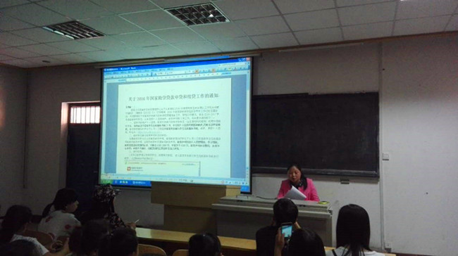 2016年5月18日下午学生资助管理中心在高新校区四楼多媒体教室召开了本学期第二期诚信教育暨续贷主题大会。参加本次会议的人员有机电系、经管系、汽车系已申请和拟申请国家助学贷款和生源地助学贷款学生及资助专员。护理学院、药检系和医学系也分别召开相同主题大会。 院学生资助管理中心孙世佳老师为学生做诚信教育暨续贷讲解