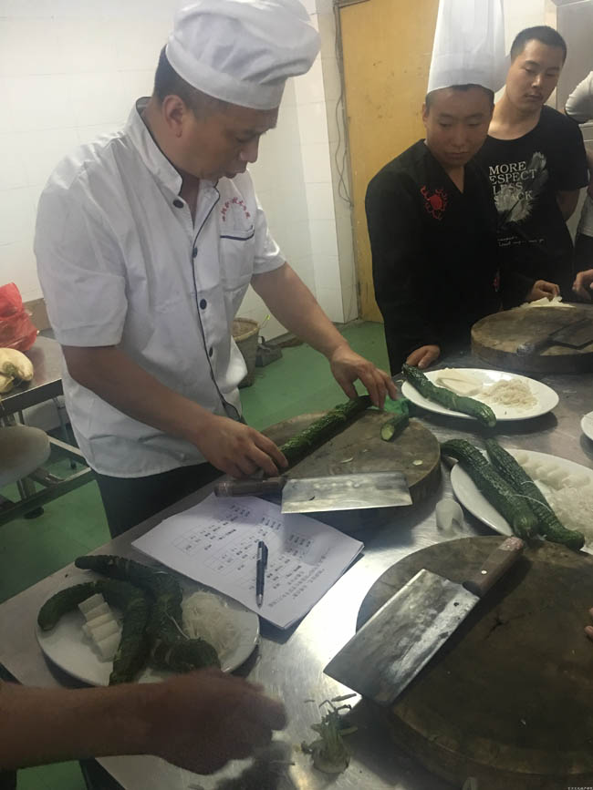 本次比赛的主题为“勤学苦练,精湛技艺”。刀功比赛分为切“银针丝、牛舌片、蓑衣黄瓜”三个比拼环节,参赛选手须在规定时间内,按照一定规格将原材料加工材料加工出来,最终按重量、造型、刀工、时间、安全与卫生五大项综合评分。由于准备充分,比赛过程中,选手们操作起来得心应手,用萝卜制作的“银针丝”犹如银针一般;制作的“牛舌片”也宛如片片牛舌,均匀透明;而用黄瓜制作的蓑衣黄瓜,更是刀距相等,深度到位,角度适当,基本无断裂。整个刀工比赛过程严格按照规范的操作流程进行。