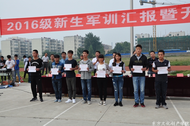 汇报结束后,院系领导向军训优秀班级、个人和内务整洁宿舍颁发了荣誉证书。东方文化创产学院学生表现优异,16级文物修复1班、16级烹调工艺与营养1班等个人和班级受到表彰。