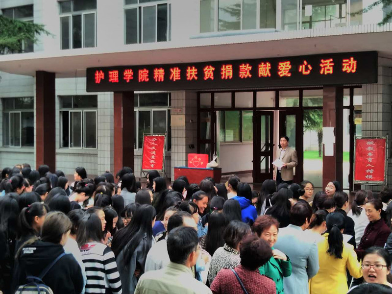 10月14日下午,以“精准扶贫———为扶贫点捐款 ”为主题的学生捐款仪式在机场北院和红山路院同时进行。护理学院、药检系、医学系共2000余名师生参加,各团支部、班级代表依次手握装满爱心的信封,放入捐款箱。护理学院院长张志友、院团委副书记姚俊红参加此次活动。另外,学院其他院系的在校生纷纷不同形式捐款,共捐款14280.5元,学生用自己的行动,为贫困村献出一份爱心!