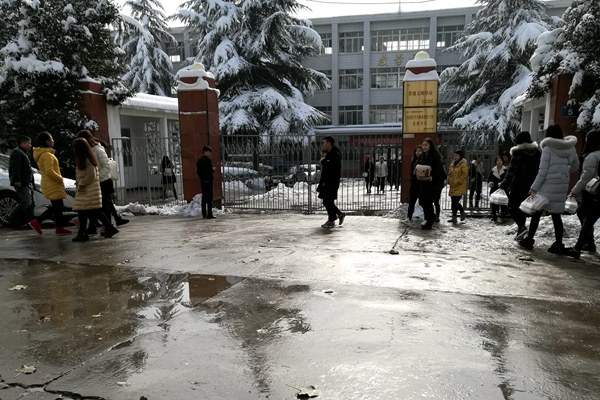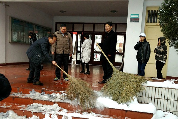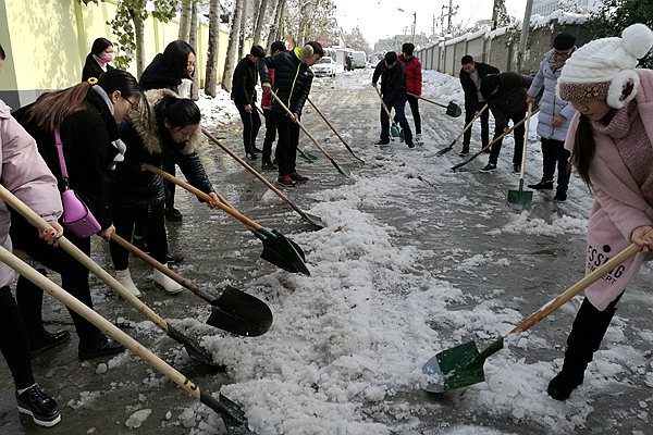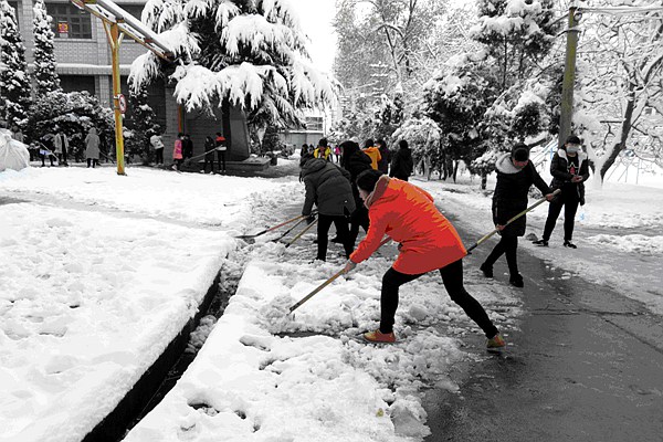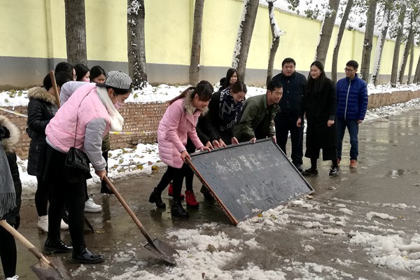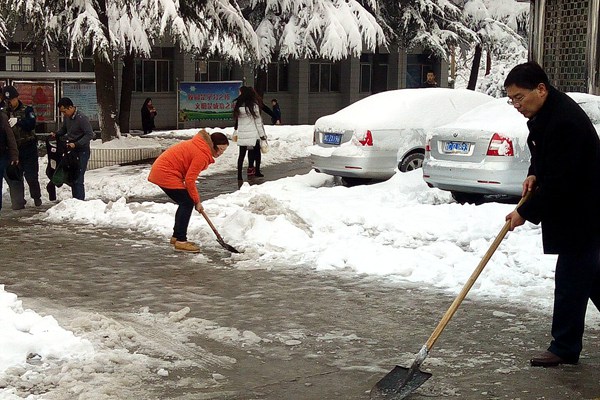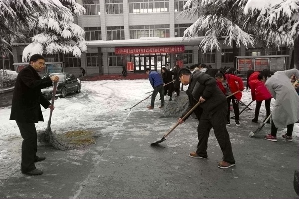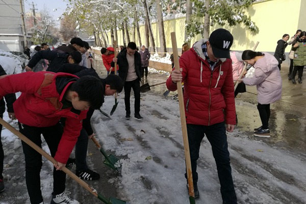 扫雪现场,虽然清扫工具只有二十几把铁锹和几把大扫帚,但是这丝毫没有影响到大家的热情和工作效率。在领导和老师的带领下同学们热情高涨,纷纷拿着铁锹和扫帚,推的推,铲的铲,扫的扫,清理着院内路面上的积雪,虽然大家的手和脸都冻得通红,却没有一人喊苦叫累。经过3个多小时的劳动,院内主干道积雪被清理得干干净净,为学院师生开通了一条干净安全的通道。