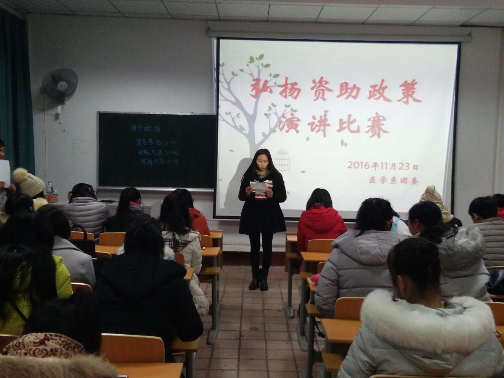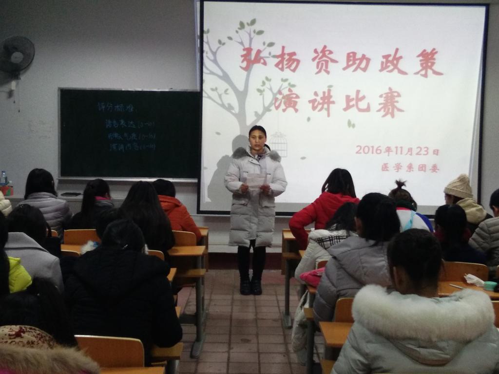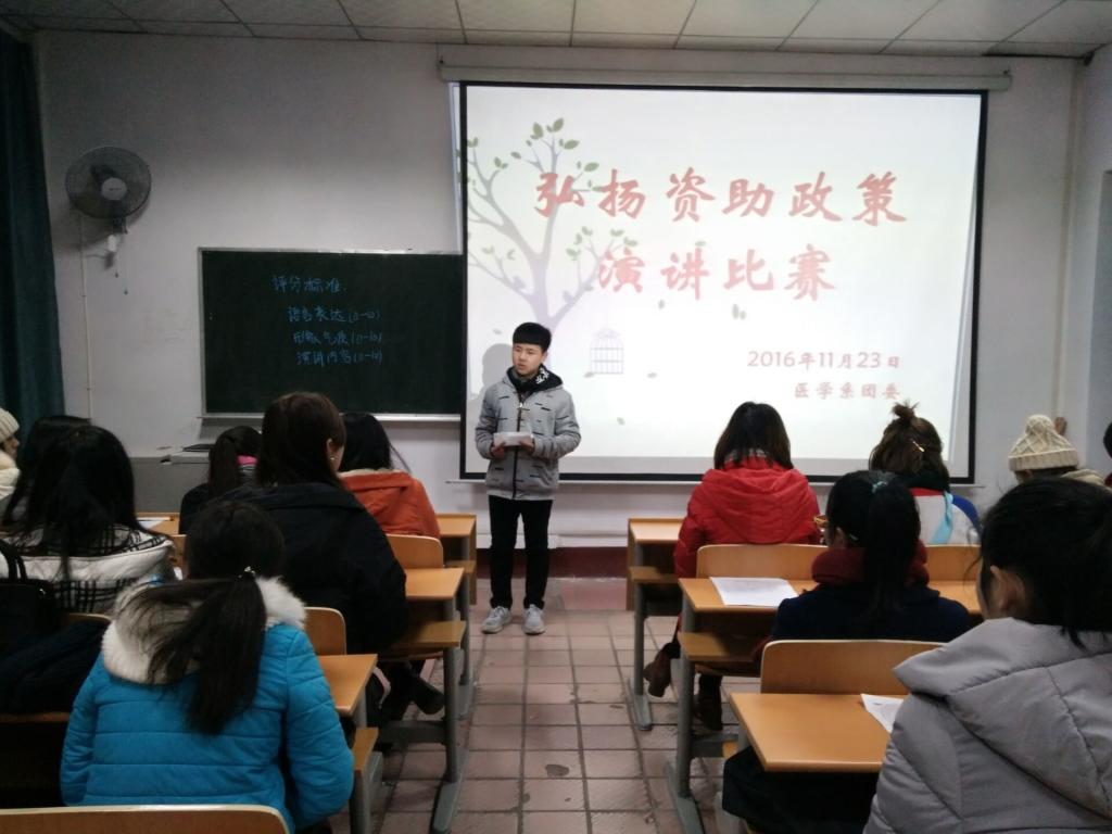 医学系各个班级享有资助的同学以“弘扬资助政策”为主题进行了演讲比赛,他们深刻讨论了励志成才之间的关系和对人生的意义,有同学说:“正当我无奈之时,老师告诉我一个好消息,就是申请国家助学金,国家助学金让我们不再为那巨款学费而忧心忡忡,更不用因为学费之事而走访亲朋好友,甚至不用在电话里低声下气的向亲戚诉说学费之苦,国家助学政策为我排忧,给我带来新希望”。他的演讲说出了我们的心声,让我们感受到了国家对贫困生的关怀。