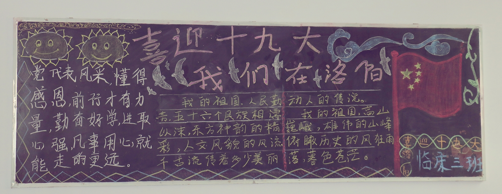 在党的十九大召开前,我系在院团委(学生处)的指导下于2017年9月24日在机场校区北院开展了以“喜迎十九大 ”为主题的黑板报绘制活动。