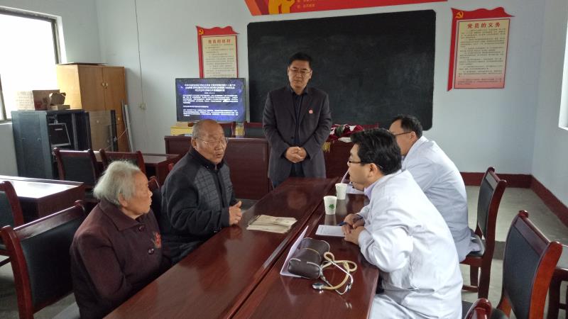 冒着绵绵秋雨,上午十点半一到目的地,等候看病的该村和附近的群众就把专家们围得水泄不通。专家们立即投入到紧张的工作中,细心地为前来求医问诊的村民体检、量血压、测血糖等,为病人切脉、听诊、耐心询问患者身体状况、分析病情,并讲解注意事项,解答常见病、多发病的预防诊治及愈后疑难问题。参加义诊的医务工作人员还为在场的村民们详细讲解医疗卫生、健康保健基本知识。孙敏副书记、村党支部书记杨栓、驻村第一书记王新涛、驻村工作队队长张战杰及第三人民医院眼科专家携带眼科裂析灯深入到患有严重白内障行动不便85岁高龄的困难户齐山峰家中现场检查,当场决定由学院积极协调,为齐山峰老人免费做白内障清除手术。
