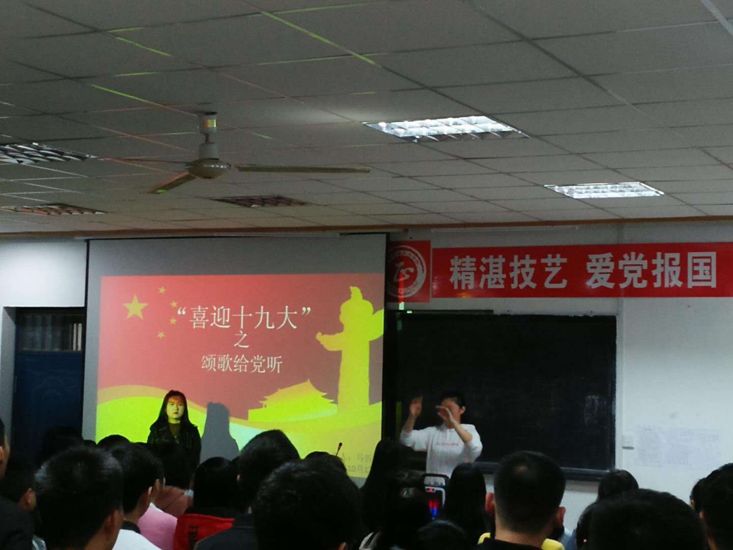 在院团委(学生处)的指导下,为激发全体学生的爱党爱国情怀,唱响时代主旋律。我系于2017年10月17日在机场校区北院进行了由医学系辅导员马侨丹主持的“喜迎十九大”诗词朗诵会。