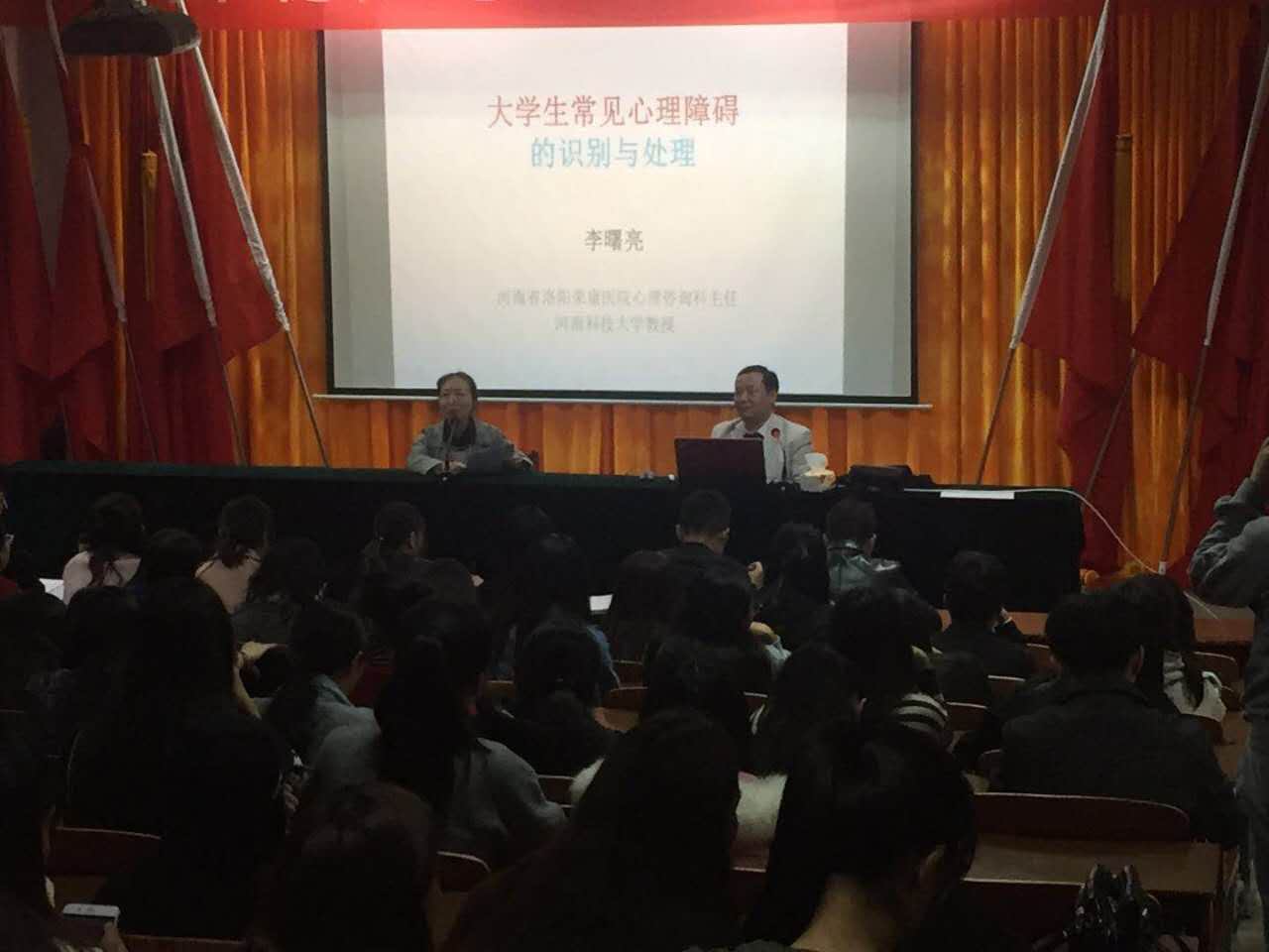 为促进大学生健康成长,营造校园和谐氛围。我系2017级辅导员及各班心理委员、宿管心理联络员于2017年10月25日在机场校区南院学术报告厅参加了由学院主办的以“理性平和、健康心态”为主题的心理健康教育专题讲座。由河南省洛阳市荣康医院心理健康咨询科主任李曙亮教授担任主讲。