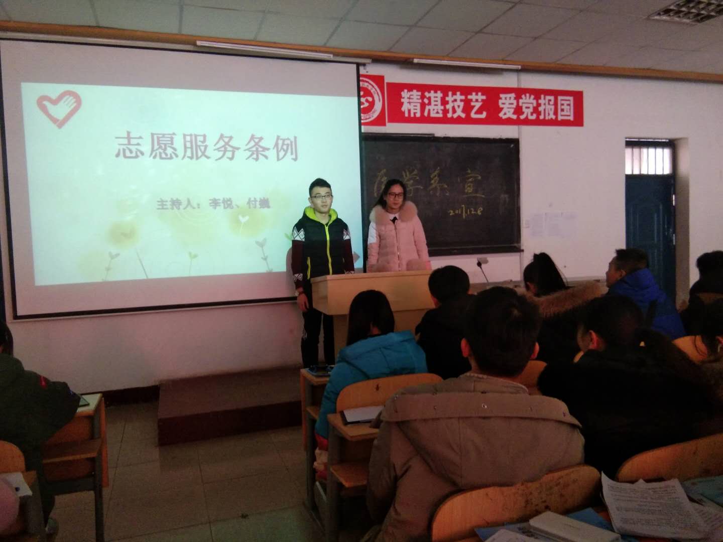 为了让同学们了解志愿者活动,明白志愿者精神,积极参加志愿者活动。我系于2017年12月8号在机场路北院第一多媒体开展了“志愿者服务条例”知识讲座。