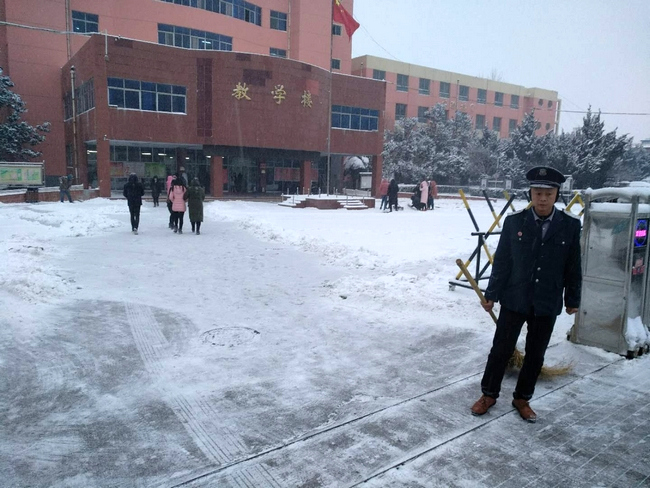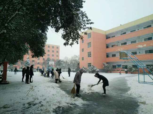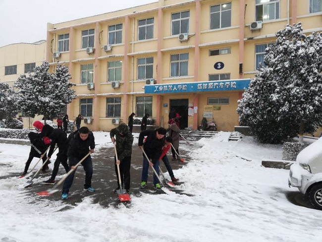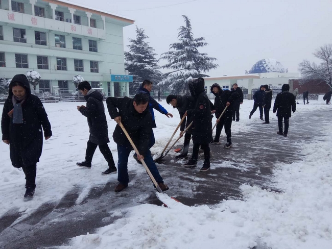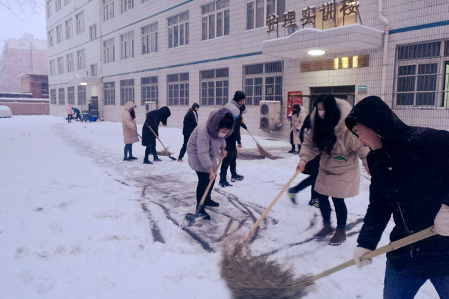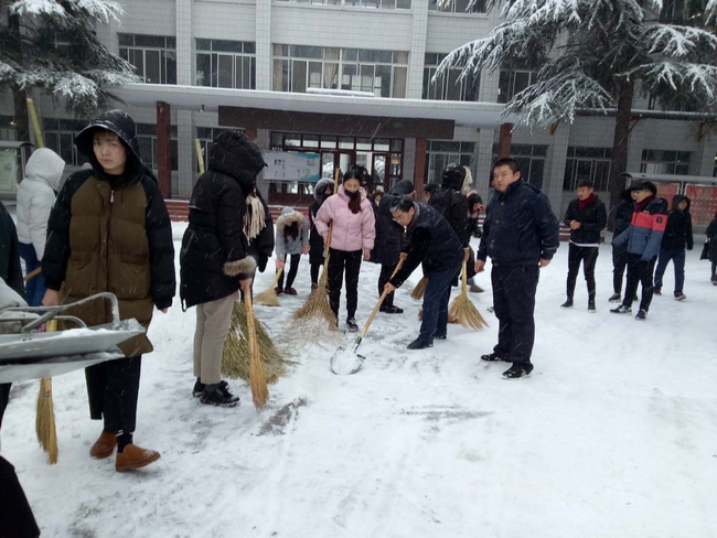 今晨天还没亮,各校区各系部处室的老师们便一队一队的出现在了校园各处,开始清除路面积雪,他们齐心聚力,铲的铲,推的推,扫的扫,师情融积雪,温情似暖阳。校园内一片沸腾,热火朝天的扫雪场面给寒冷的雪天带来一丝暖意,很快,白茫茫校园中就出现了一条条逶迤的小路。虽然雪还在不停地下,天气依然十分寒冷,但这并不影响大家的劳动热情,大家挥动铁锹,舞动扫帚,个个精神抖擞、干劲十足,成为校园里一道最靓丽的风景线。