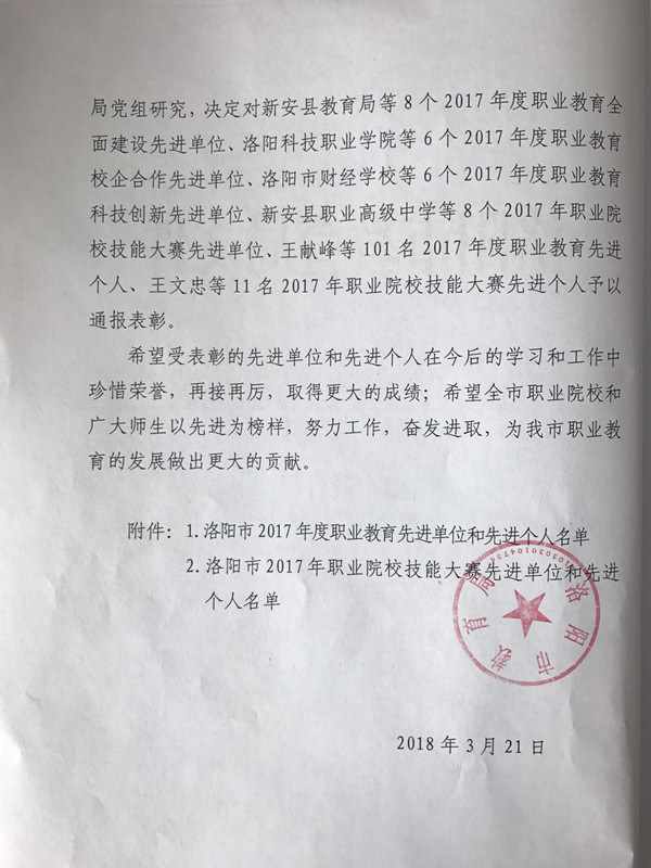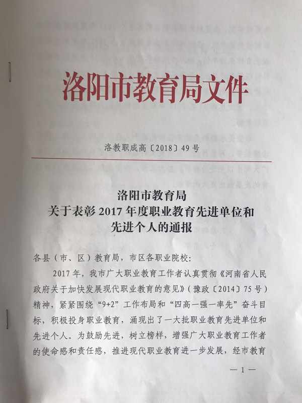 3月22日洛阳市教育局召开了职业教育工作会议,会上表彰了2017 年度职业教育先进单位和先进个人、2017 年职业院校技能大赛先进单位和先进个人。