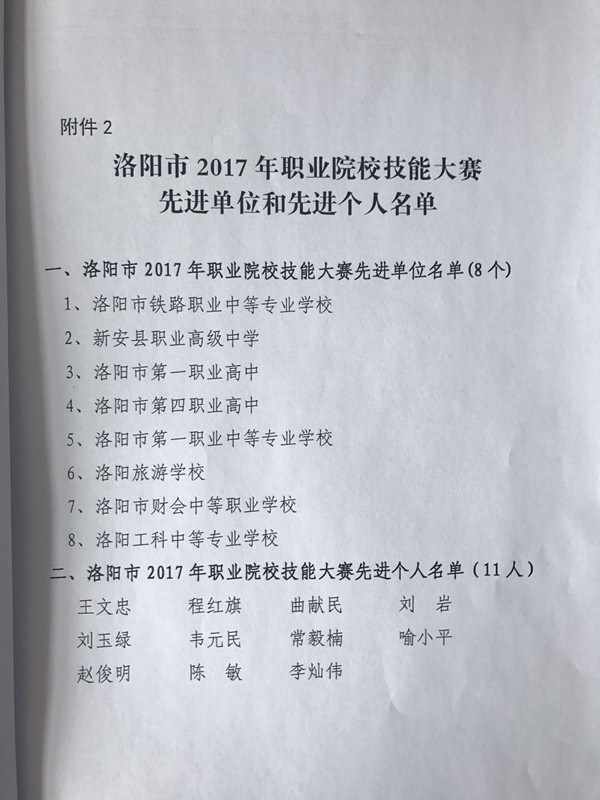 祝贺我校被评为洛阳市2017年职业院校技能大赛先进单位祝贺我校党委书记、校长韦元民同志被评为洛阳市2017年职业院校技能大赛先进个人