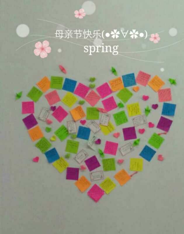 各班团支书组织同学们一起观看了歌颂母爱的影视作品,大家把想对母亲说的话写一个小卡片,粘贴到本班教室前面黑板上面构成一个图片墙。