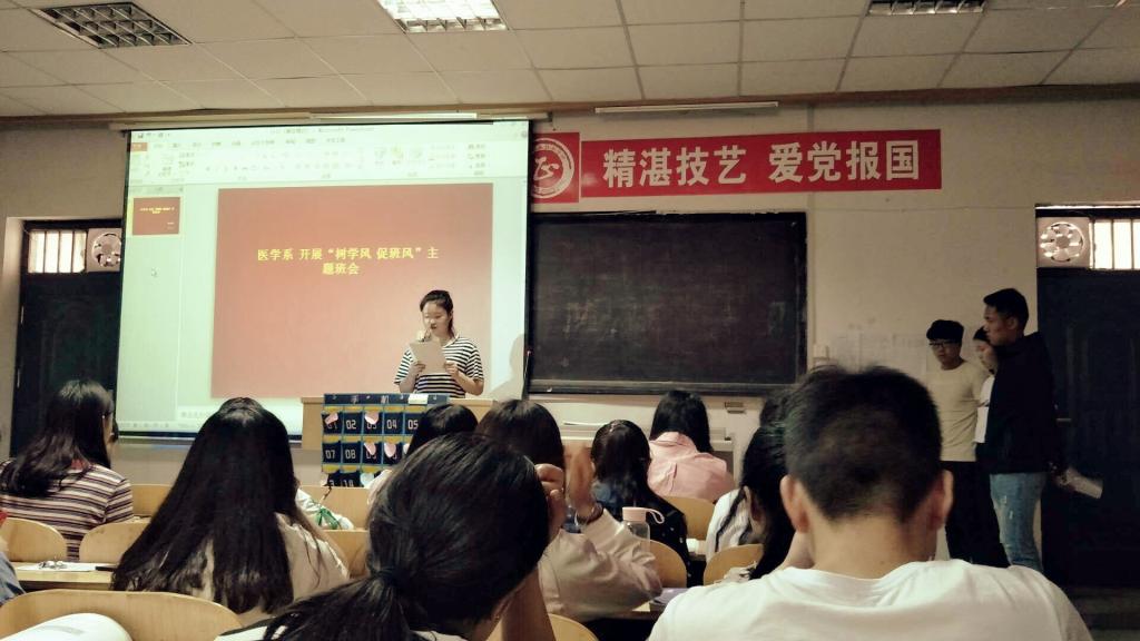 2018年5月18日,医学系学生在辅导员马侨丹的组织下于机场北校区第一多媒体教室举办“树学风,促学风”主题班会,针对近来班级中出现的学风不正,上课玩手机等问题进行了深刻教育。