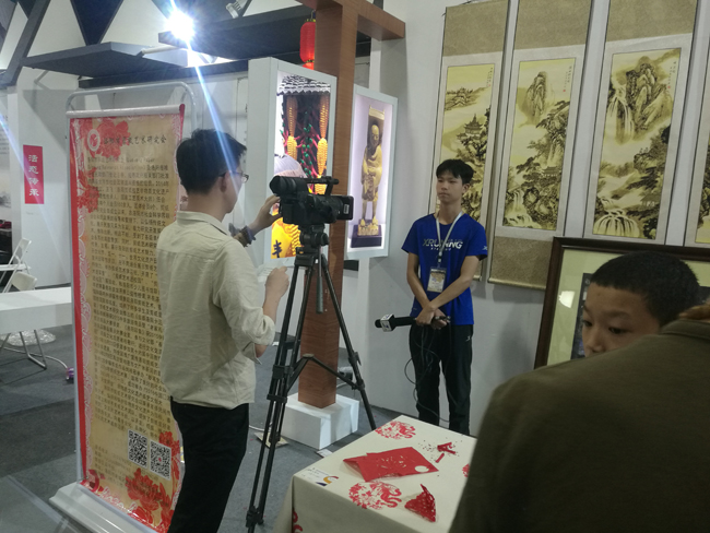 2016年,我院与洛阳剪纸艺术研究会合作,将非遗剪纸艺术引进校园,引入课堂,组建社团,提升了学生的整体文化素养,培养了十几名剪纸传承人才,非遗传承与创新取得了可喜的成绩,彰显了文化与旅游学院的文化特色,促进了学院的发展。本次展出的作品中,《盛世和谐》获得文创精品大赛银奖。赛后,王飞大师和我院2016级五年制文物修复1班学生马丹阳接受了洛阳电视台的专题采访。