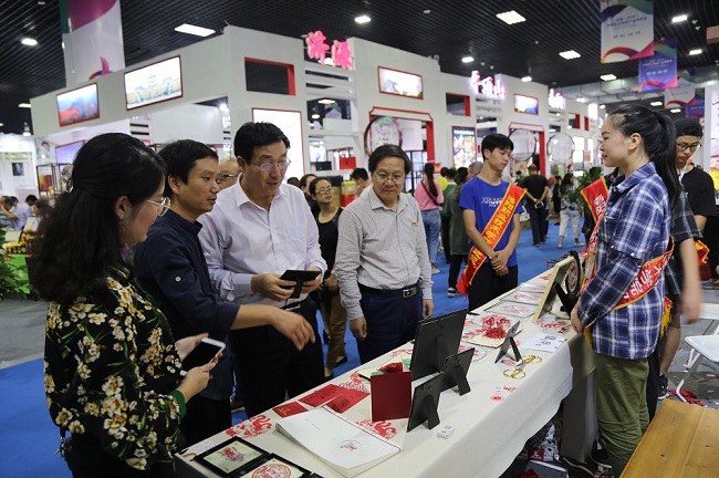 2018年9月23日下午,程相朝院长亲临“首届(2018)中原文化旅游博览会”,参观指导我院剪纸艺术社团的剪纸作品展。文化与旅游学院常务副院长王伟浩、校团委副书记姚俊红陪同,洛阳剪纸艺术研究会王飞会长现场迎接。