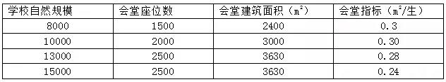 1992版旧标准第三十条规定:1000人及1000人以上规模的学校可规划建设一座会堂。会堂的规划建筑面积指标不得超过表3-1的规定。