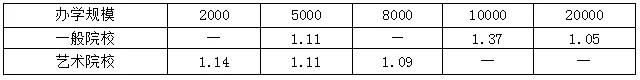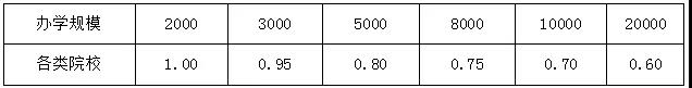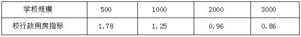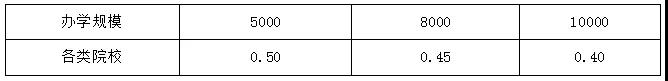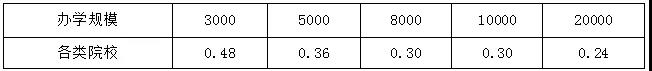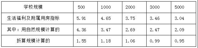 注:1学校办学规模小于或大于表中所列的规模值时,其指标应分别采用表中最小或最大规模的指标值;学校的办学规模介于表列规模值之间时,可用插入法取值。