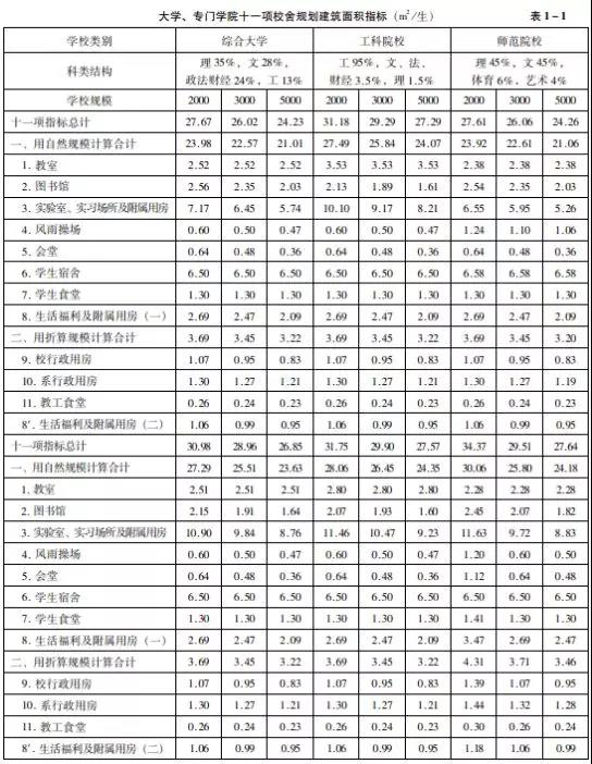1992版旧标准第十一条规定:大学、专门学科的科类结构应由学校根据本校的状况及今后一段时间内的人才需求情况进行预测。本规划指标根据全国普通高等学校的现状及今后的人才需求情况,预测了表2所列的各类大学、专门学院的科类结构,并据以确定教室、图书馆、实验室实习场所及附属用房的按学校类别分的规划建筑面积指标。执行本规定指标时,如学校预测的科类结构与表2出入较大,可据实对上述三项规划建筑面积指标进行调整。