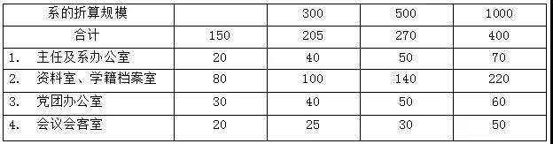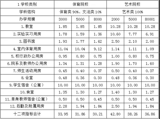 3办学规模小于2000人、专业门类多的艺术院校,其教室、实验实习用房、院系及教师办公用房、后勤及附属用房4项指标,在上表基础上可乘以调整系数1.2〜1.4。