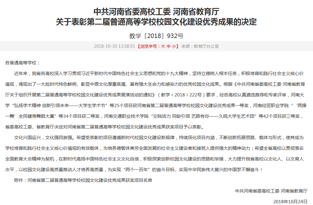 2018年12月4日,在中共河南省委高校工委 河南省教育厅组织开展的第二届普通高等学校校园文化建设优秀成果评选活动中,我院申报的《“1+2+2”学生思政教育与安全管理工作模式》实践育人学生工作品牌荣获三等奖,学生处处长刘志宇前往河南大学民生学院参加了第二届普通高等学校校园文化建设优秀成果展演活动,品牌申报人医学院辅导员张海迪随同参展学习。