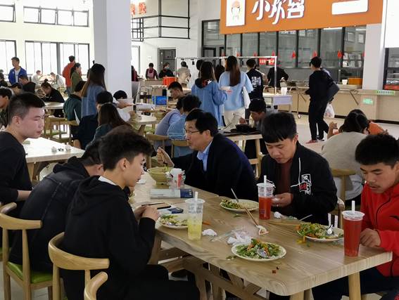 程院长带队查看了学生食堂就餐区域、洗消区域、厨房、粗加工区域等。在调研过程中各食堂负责人向程院长汇报了食堂管理、食品安全、饭菜花色品种及卫生提升等方面的情况。程院长与正在就餐的学生就饭菜味道、种类数量、饭菜价格、卫生状况等问题进行亲切交谈,并与窗口经营者就经营情况、使用原材料来源等相关问题进行了详细询问。