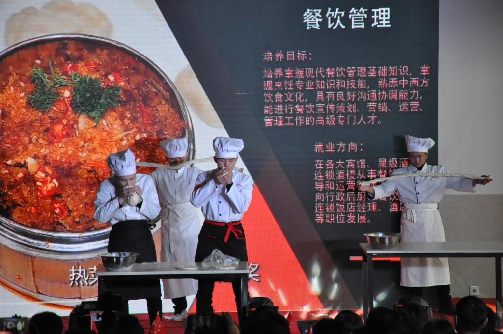 文化与旅游学院烹调工艺与营养专业的学生把实训课堂搬到了舞台上,吹面气球,拉面技艺表演令现场观众叹为观止。