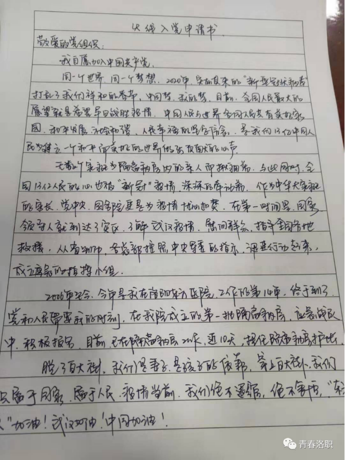 2001级护理3班毕业生沈婷婷 ,是洛阳市东方医院隔离病区护士长。在一线持续工作15天,在疫情来临,她还递交火线入党申请书,因为这样可以更坚定地冲锋前线。