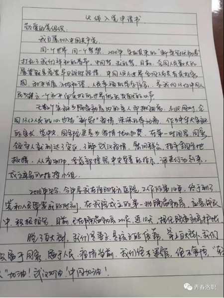 2016级大专药学3班毕业生蔡冰梅,现在洛阳市中心医院药房工作。在这个特殊的时期,医院所有的医务工作者都放弃了春节休假,坚持在各自工作岗位上,全员在岗待命。她作为医院药学部的一员、一名即将转正的预备党员,就要起到模范带头作用,尽一点自己的微薄之力。 在接到医院防治新型冠状病毒肺炎疫情通知后,药学部迅速建立了发热门诊药房,按照医院要求,在药房人员紧张的大环境下加强发热门诊药房力量,以实际行动加入到这一场抗击新型冠状病毒感染的肺炎阻击战中。“我是党员,我带头防控疫情当先锋”,无论任何时候任何地方,只要国家需要,人民需要,她们都义无反顾!