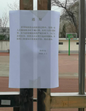 会后,西工校区“新冠肺炎”防控专班成员对校园进行了巡视检查。发现操场内有家属不戴口罩散步,还有人在打篮球。在对有关人员进行劝离的同时,决定立即封闭操场,以防发生疫情。